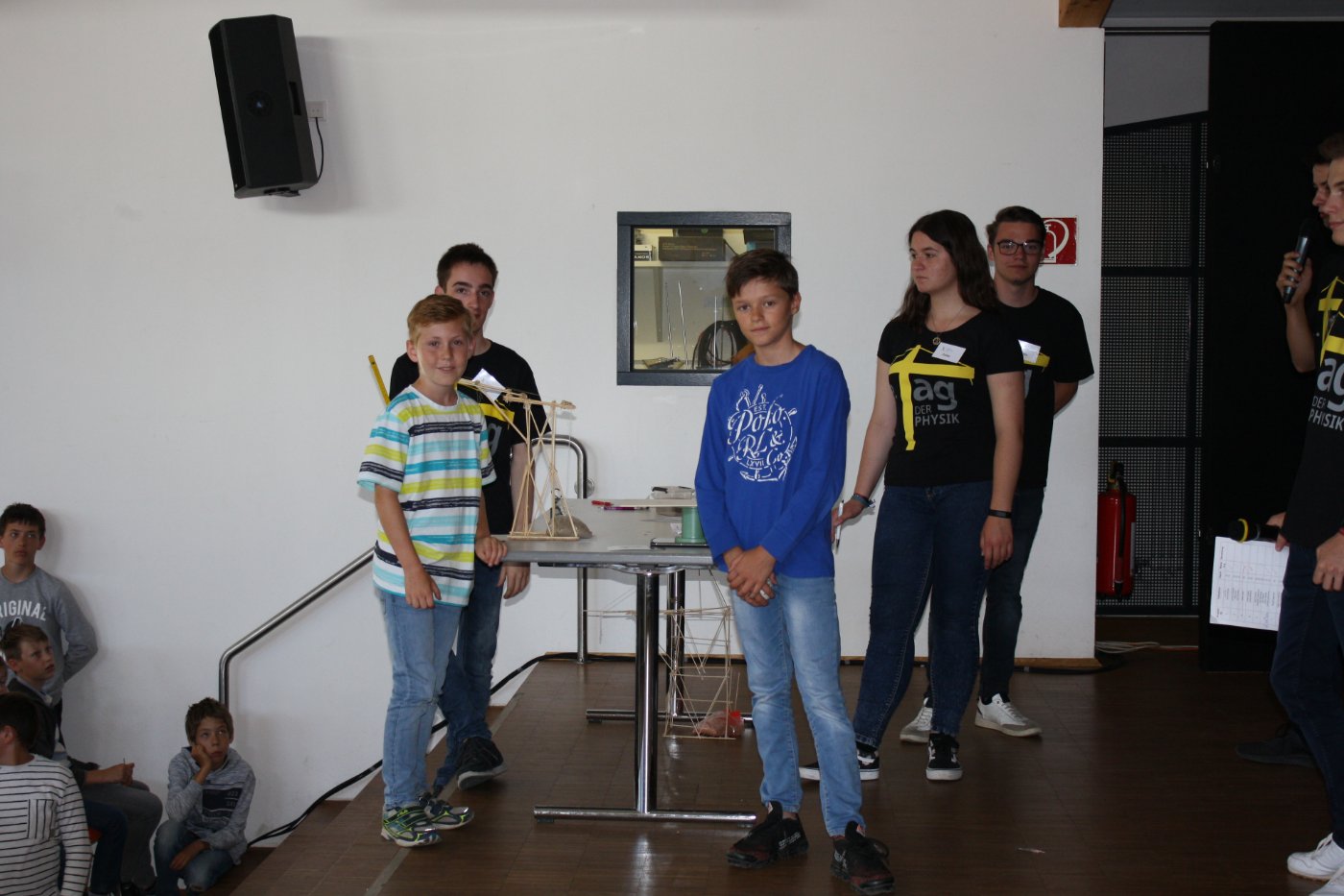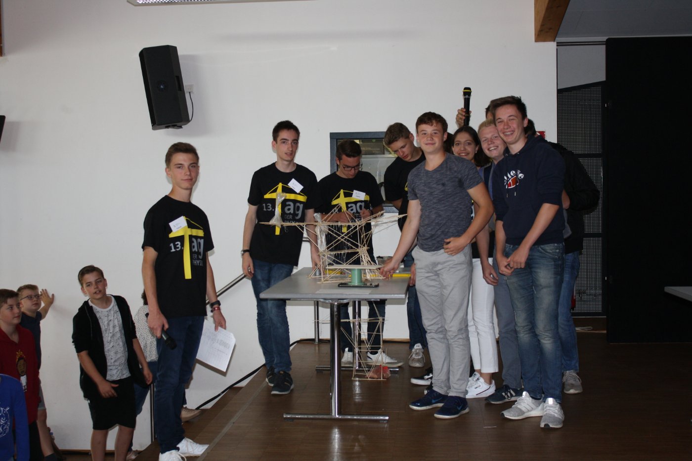 Der Wettbewerb war ein voller Erfolg. 114 Schülerinnen und Schüler in über 50 Teams stellten sich der Herausforderung einen Lastkran aus Schaschlikspießen, Kleber und Faden zu bauen, der eine Mindesthöhe von 40 cm haben musste und an dessen Ausleger in einem Abstand von 25 cm ein Gewicht von 500 g angehängt wurde. Der Kran durfte ein Gegengewicht z. B. in Form eines Sandsackes besitzen und musste der Last 30 Sekunden standhalten. Ziel war es, den leichtesten Kran mit dem geringsten Gegengewicht zu bauen. Die Schülerinnen und Schüler bewiesen viel Ausdauer und Kreativität, sowohl beim Entwurf der Kräne, als auch bei der künstlerischen Gestaltung.