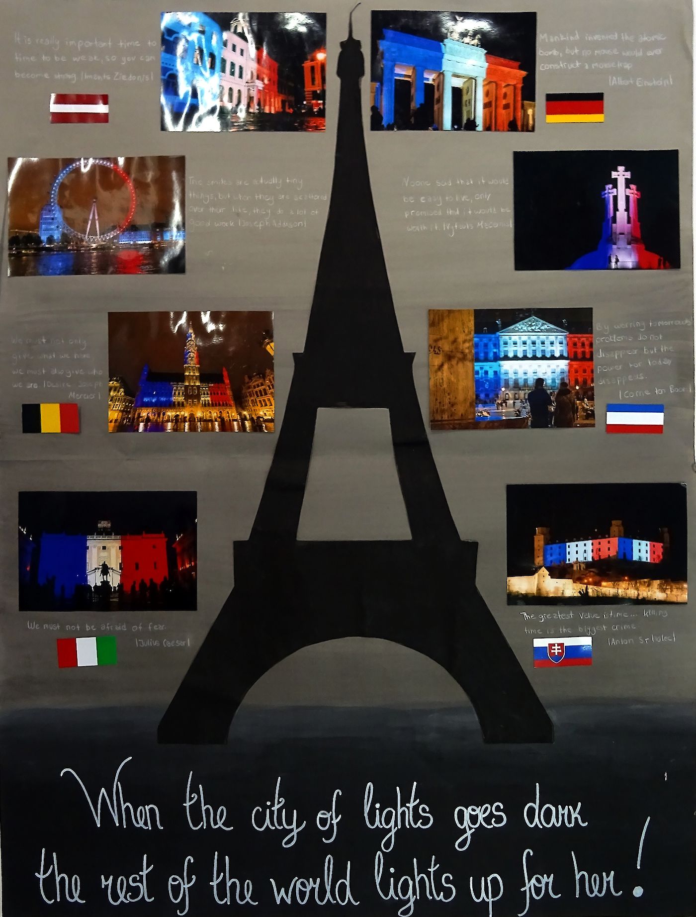 Antonias und Monas Collage, die im Kunstunterricht der Europaklasse entstand, thematisiert eine dieser neuen Herausforderungen, die sich Europa in Zeiten von Terrorgefahr und Terrorakten stellen muss. Die Collage zeigt die Anteilnahme und Solidarität vieler europäischer Länder nach dem Terrorakt 2015 in Paris, sowie Zitate von berühmten Persönlichkeiten über Werte, die ein Europa der Zukunft ausmacht.