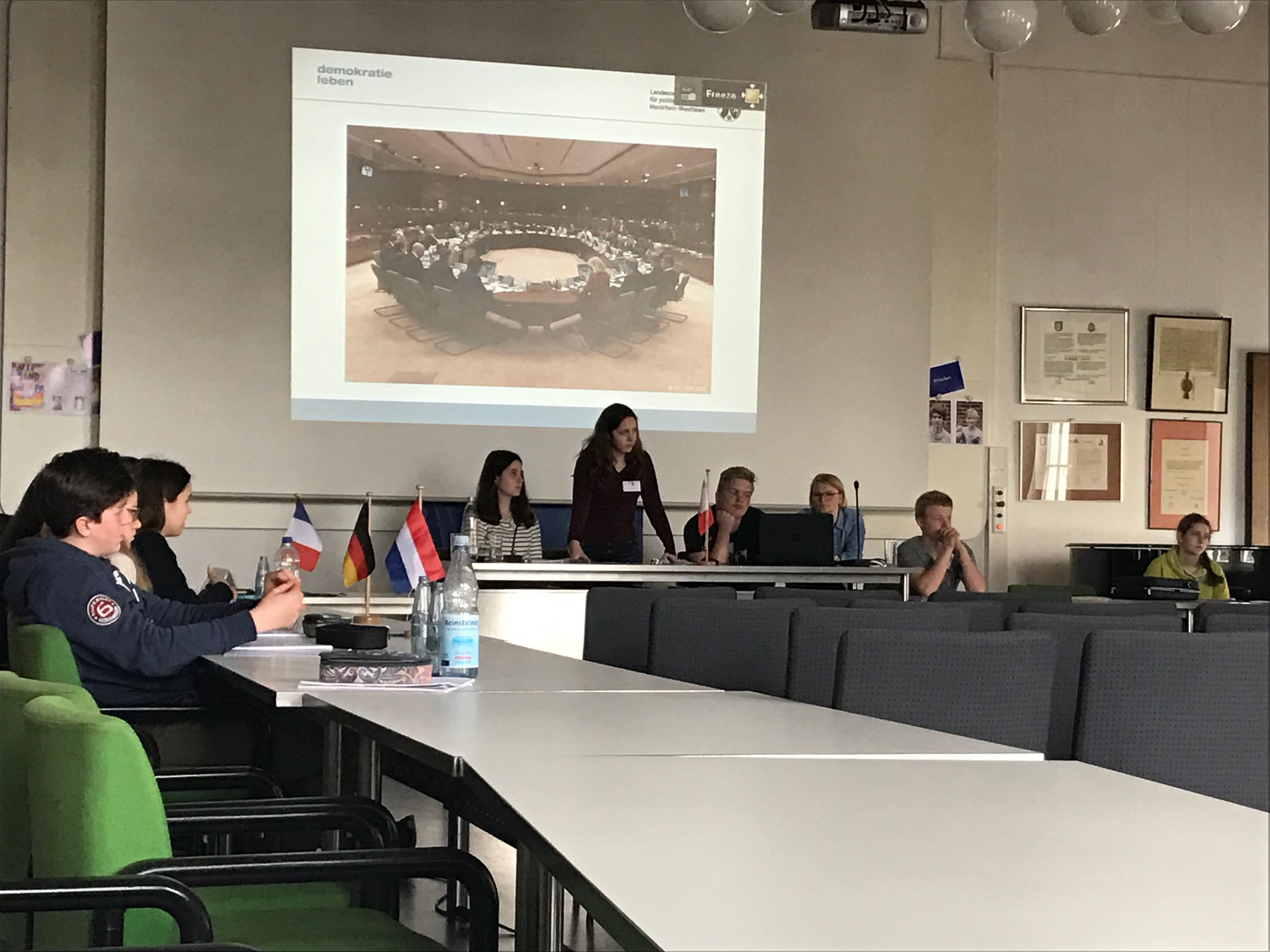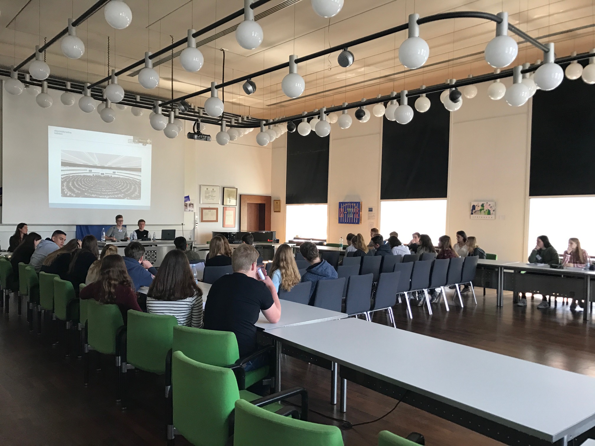 Die Bedeutsamkeit der Europäischen Union insgesamt wurde dann zu Beginn des Planspiels auch von unserem Bürgermeister hervorgehoben, der das SSGX persönlich begrüßte, ehe das Europateam NRW, beauftragt von der Landesregierung, das Ruder übernahm, um durch das Planspiel zu leiten. Die Schülerinnen und Schüler mussten in Kleingruppen verschiedene Aufgaben bewältigen, ehe es am Ende zu einer großen Abstimmung im Sitzungssaal des Rathauses kam, bei der ein Beschluss zu der Verteilungsfrage, der Frage nach dem Familiennachzug sowie der Frage nach dem Arbeitsrecht gefasst werden sollte.